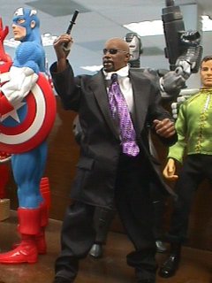 Spenser is a bit more complicated. His body is a 9' Captain James T. Kirk, also from Playmates. {Kirk's original head spent a little time here but will soon go back into storage.}