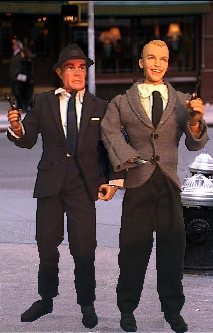 Felix Leiter is a "Moving Soldier of the World" figure with his right hand replaced with a hook made of florist's wire, and his head swapped with that of Mattel's "Frank Sinatra: the Recording Years" painted blond. By the time I tookl the picture of Felix flashing his ID in Washington DC, I'd replaced the florist's wire with a prosthetic hook from a 1970's-era "Jay J. Armes" figure. His shoes are from a Civil War "Ultimate Soldier. The pants are from the 12" "Blues Brothers 2000 'Mack'" with the shirt from the Sunny Smile "Strike Force Assassin" and a jacket hand-made by my wife. His Colt .45 is an "Ultimate Soldier" prop.