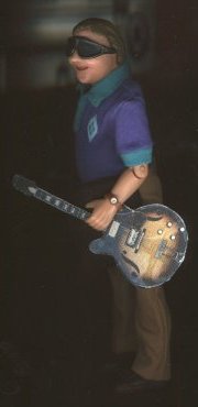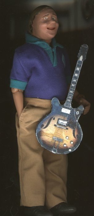 The microphone and stand is from Exclusive Premiere's "Happy 95th Birthday" George Burns figure, and the guitar is a .gif file of a 1966 Harmony Meteor (identical to my own) printed on label paper, stuck to a sheet of foamcore, and carefully cut out with a very sharp Xacto knife. The sides and back of the guitar were colored black with a "Sharpie" black permanent marker.
