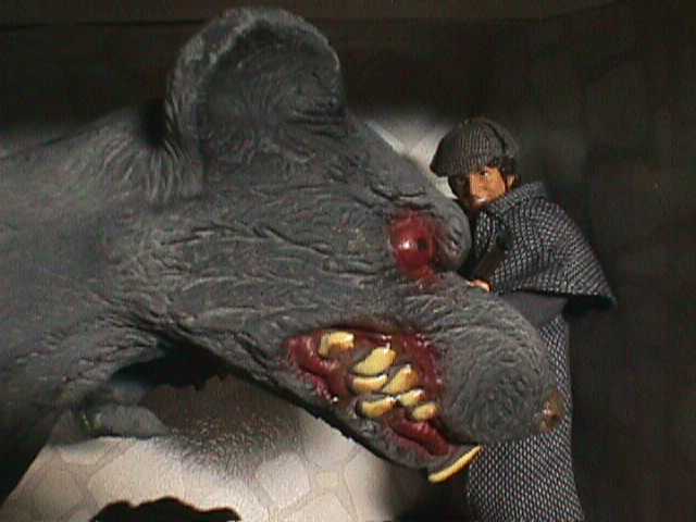 One of the climactic moments of "The Talons of Weng-Chiang" is the Doctor's confrontation with a gigantic, mutated rat. Given that it's October, a suitably terrifying rodent was readily available, and transforming the interior of a shelf to a London sewer (Or a hallway in a castle, should I need one) was a simple matter of floor tiles and contact paper.