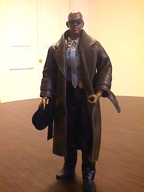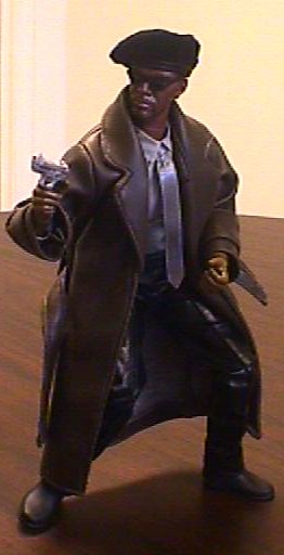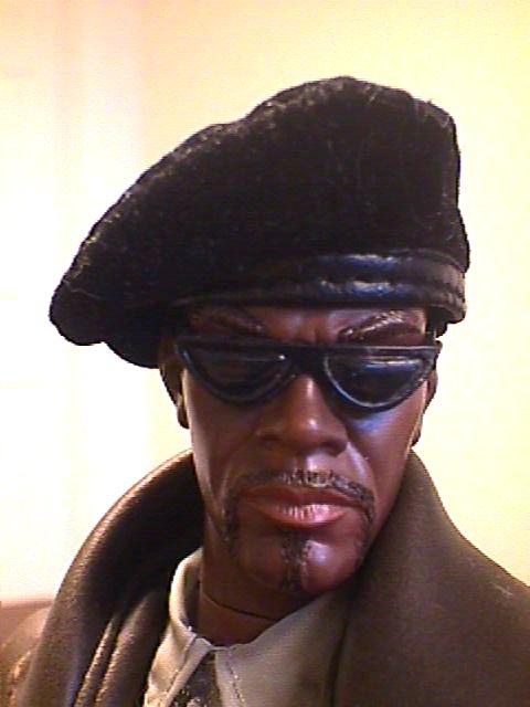 John Shaft is a Blue Box Toys "Body Builder" wearing Elvis Presley's leather pants and one of Ken's shirts, with the Brown Trenchcoat from the Sunny Smile Strike Force "The Assassin" figure and a wonderful black cloth beret from "Astro Dan" Edwards. His sunglasses are from Quentin Tarantino and his gun is from a Hasbro GI-Joe Police Officer. His badge is cut from the front of the Exclusive Premiere "Ralph Kramden" hat, and painted gold.