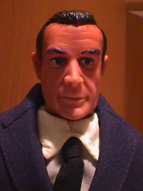 James Bond is wearing black shoes from a Civil War "Soldiers of the World" figure, custom-made black socks, Black pants from Ken, the shirt and tie from the Sunny Smile "Strike Force" Assassin figure, and Drew Carey's jacket. Bond's collapsible sniper rifle also belonged to the aforementioned Assassin. The briefcase that came with that figure looked exactly like it would carry a sniper rifle, so I replaced it with one that originally contained nail clippers, files, scissors and other manicure supplies.