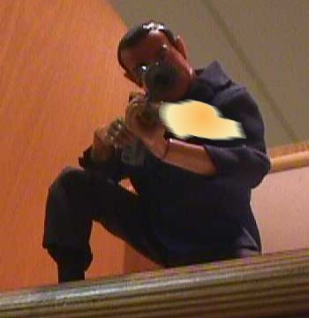 | He snaps in the magazine into place. Now the gun is fully loaded. |