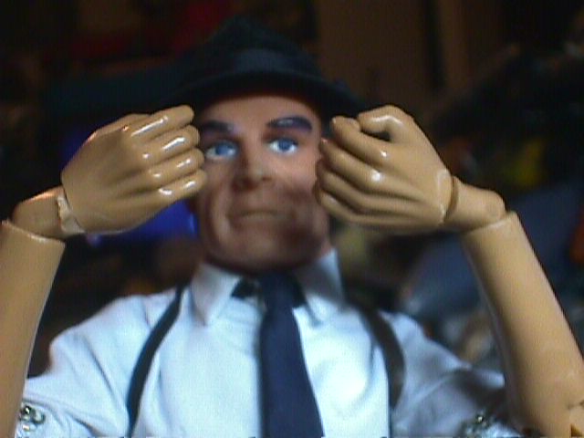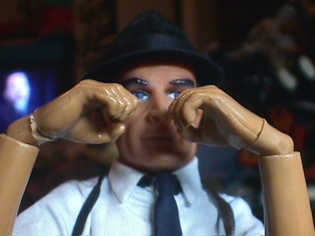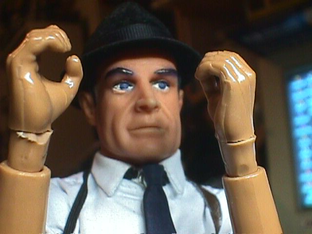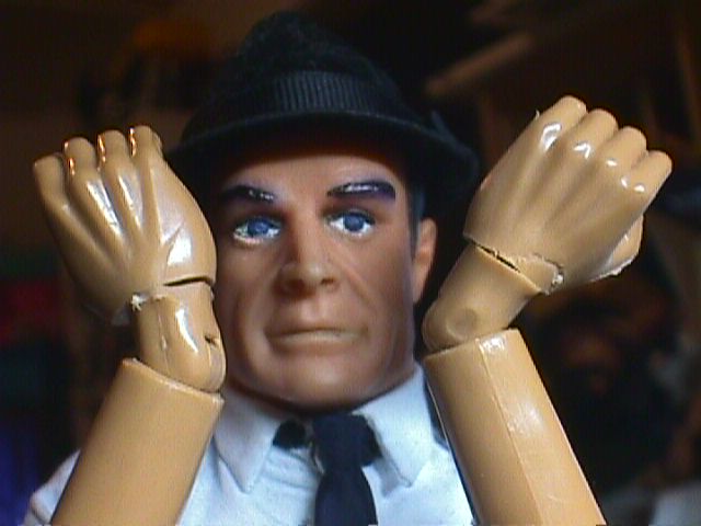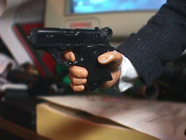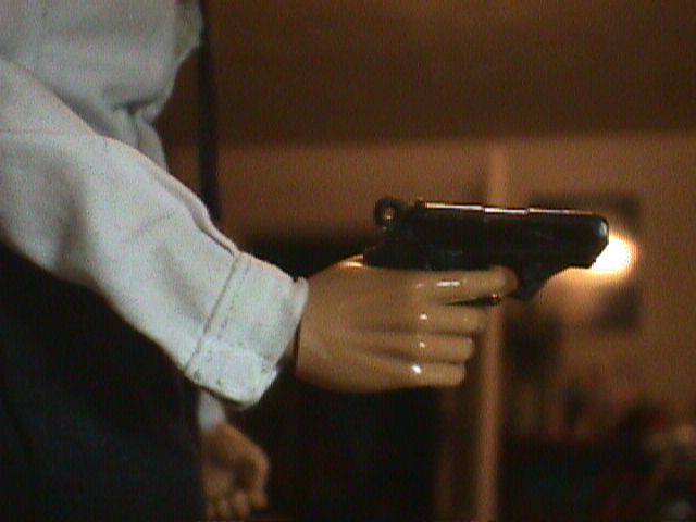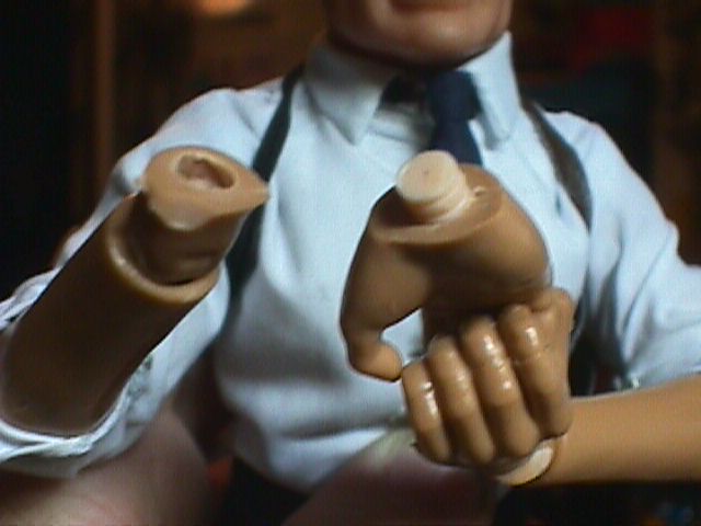 I wanted the wrist articulation of Sideshow 12" figures on a James Bond. I cut off the wrist assemblies, with about a quarter of an inch of hand, from a couple of 21st Century fists, and cut a pair of 21st "Normal Hands" very close to the wrists. I drilled holes in hands and wrist assemblies and added pegs. Et, Voila!
