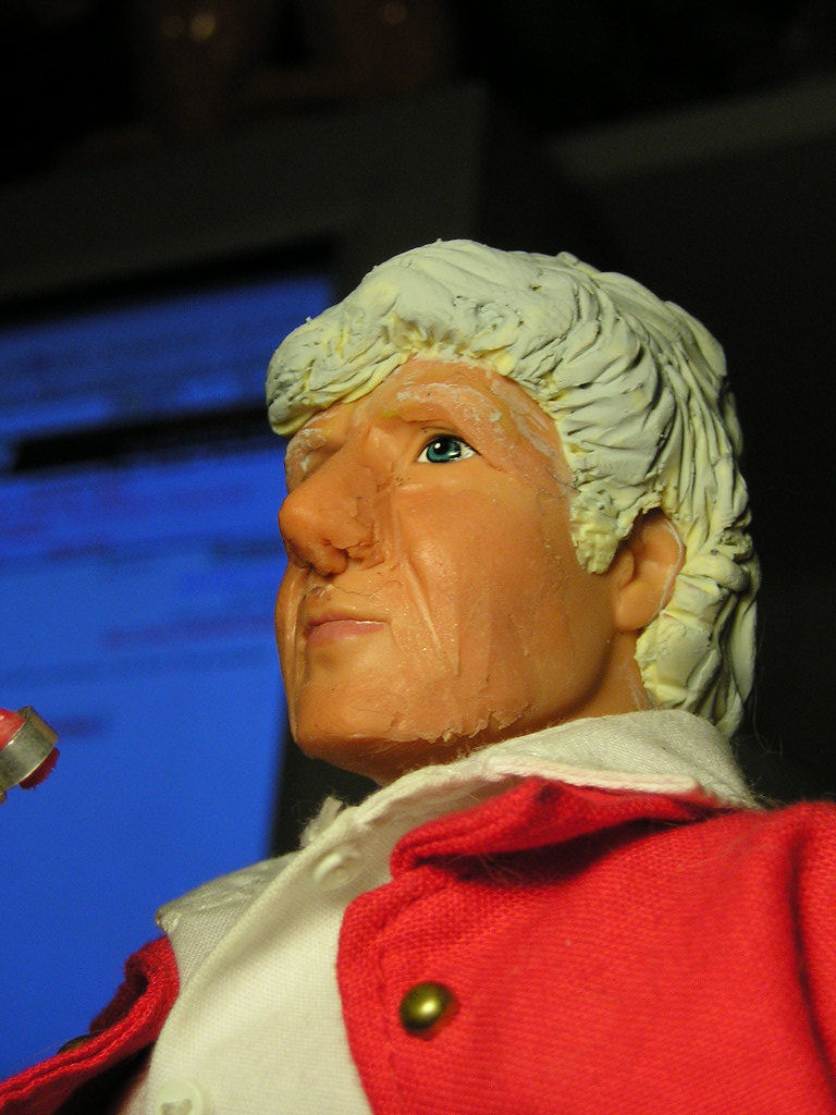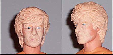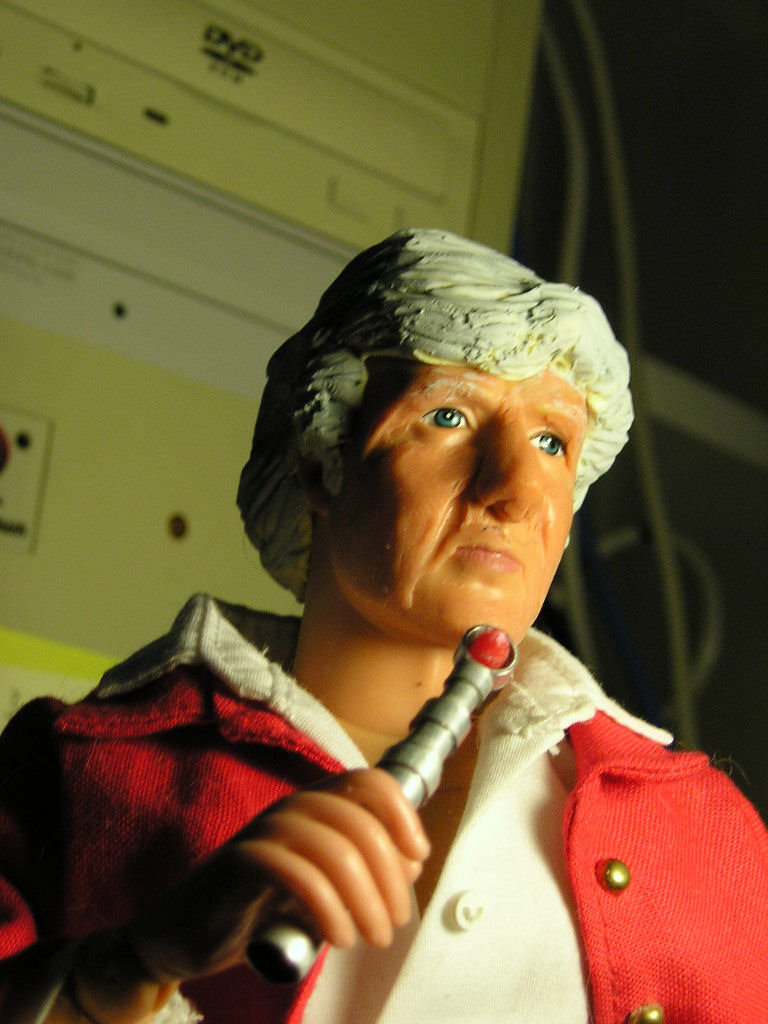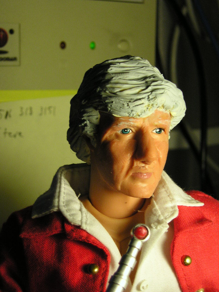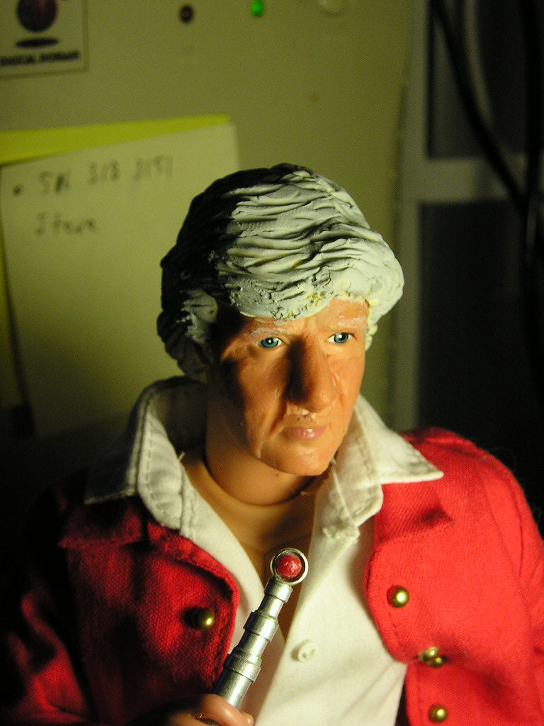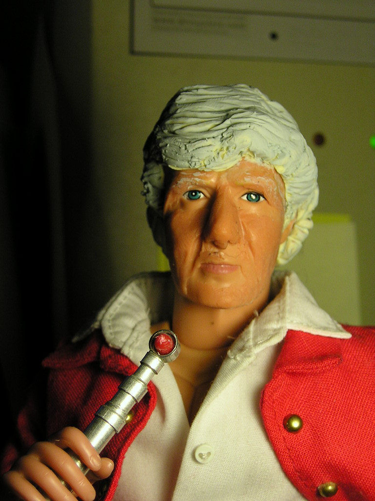 My long-distance friend Vikki Godwin has on her web-site a picture of a Power Team head in the process of being re-sculpted into a good likeness of Jon Pertwee. Well, says I, I gotta have me one of them: