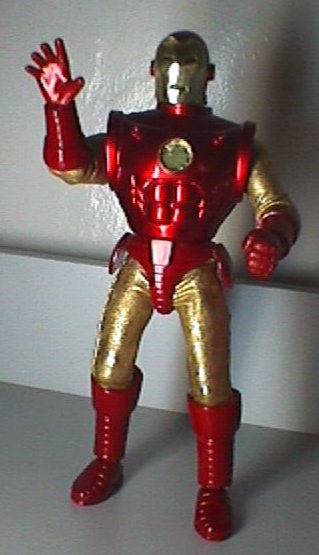 Iron Man's jumpsuit has been replaced with one made from a lovely gold metallic swimsuit lycra. His helmet's faceplate has been coveredwith a layer of the inner tray from an FC box, with eye and mouth holes X-Acto'ed in.