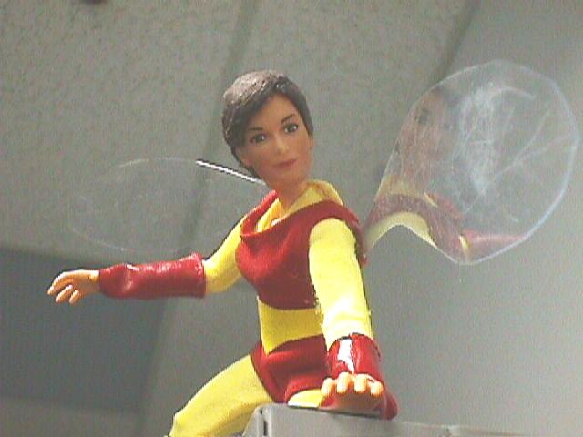 Janet Van Dyne is a Dark Phoenix body with Doctor Doom's feet, and the head of Kate Jackson as Sabrina from "Charlie's Angels" with sculpted hair. Her wings are cut from the smooth clear-plastic box from a "Moving Soldier Of The World," with little veins etched in with a dental pick.